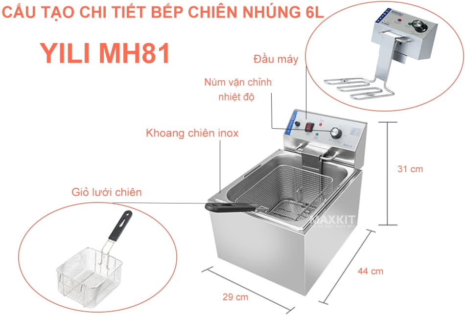 Phần cấu tạo được thiết kế thông minh với khay dầu và rổ nhúng có thể tháo rời, giúp người dùng dễ dàng vệ sinh sau mỗi lần sử dụng. Trên thân bếp chiên nhúng điện đơn 6L YILI MH81 tích hợp núm xoay điều chỉnh nhiệt độ, đèn báo và bộ phận điều khiển nhiệt giúp việc vận hành đơn giản và trực quan.