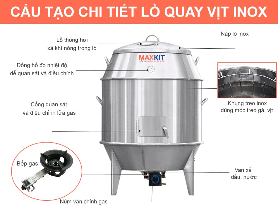 Lò quay vịt gas 100 được thiết kế theo tiêu chí chắc chắn, tiện dụng và dễ vệ sinh. Vỏ ngoài làm từ inox cao cấp 2 lớp vừa mang lại vẻ sáng bóng chuyên nghiệp, vừa giúp giữ nhiệt tốt và cách nhiệt an toàn — giảm nhiệt truyền ra vỏ ngoài, bảo vệ người vận hành.