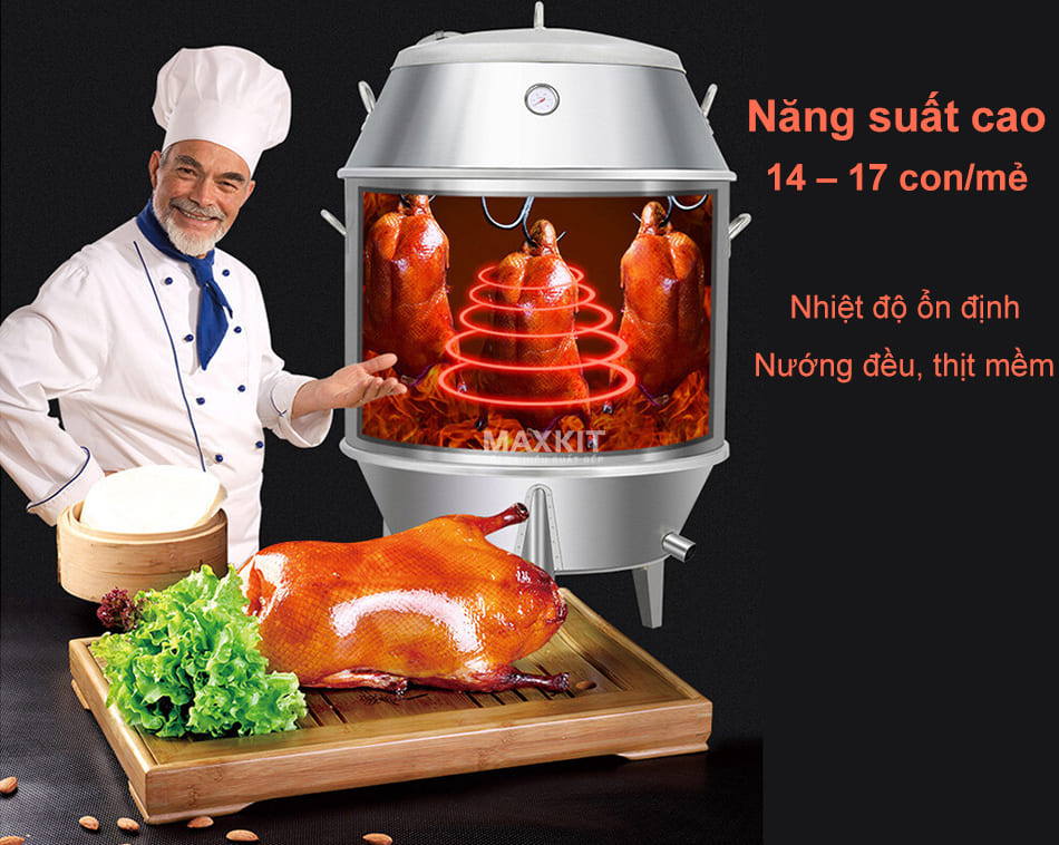 Thời gian quay trung bình chỉ từ 45–60 phút, phù hợp để cân bằng giữa tốc độ phục vụ và chất lượng thành phẩm. Thịt vịt được quay chín đều, giữ độ mềm ngọt bên trong, trong khi lớp da vàng giòn bên ngoài, đáp ứng tiêu chuẩn món vịt quay thơm ngon chuẩn vị.