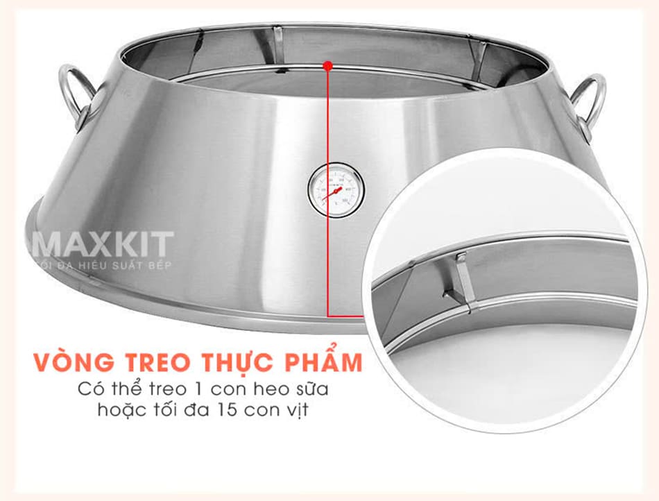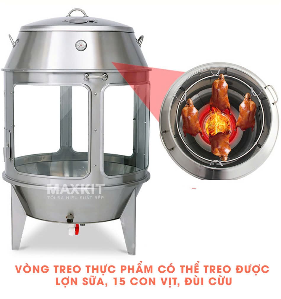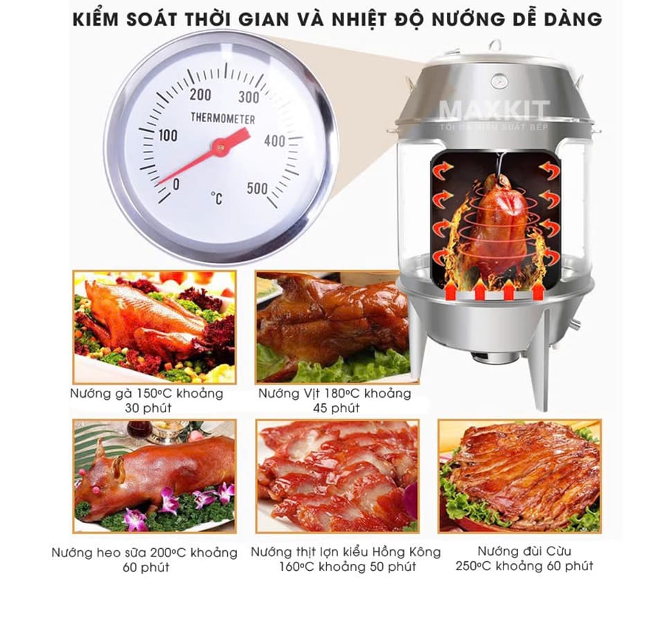 Hệ thống điều chỉnh nhiệt độ dễ thao tác, kết hợp với cơ cấu xoay đều giúp phân bổ nhiệt đồng đều quanh thân vịt, giảm hiện tượng chỗ cháy chỗ sống. Đèn chiếu sáng 500W bên trong khoang hỗ trợ việc kiểm tra màu sắc thực phẩm mà không cần mở cửa, đồng thời làm nổi bật sản phẩm khi trưng bày trước quầy.