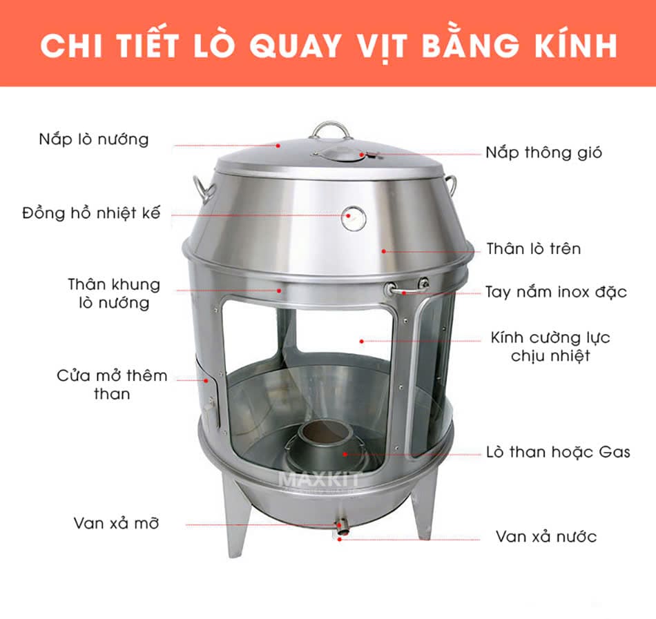 Thân lò được làm hoàn toàn bằng inox không gỉ, tạo bề mặt sáng bóng, dễ vệ sinh và chống ăn mòn trong môi trường bếp. Cửa kính cường lực chịu nhiệt giúp người dùng quan sát quá trình quay nướng mà không cần mở cửa, vừa hạn chế thất thoát nhiệt, vừa giữ vệ sinh. Hệ thống làm kín khung cửa và gioăng chịu nhiệt giúp giữ nhiệt độ ổn định trong khoang, góp phần giảm thời gian quay và tiết kiệm gas.