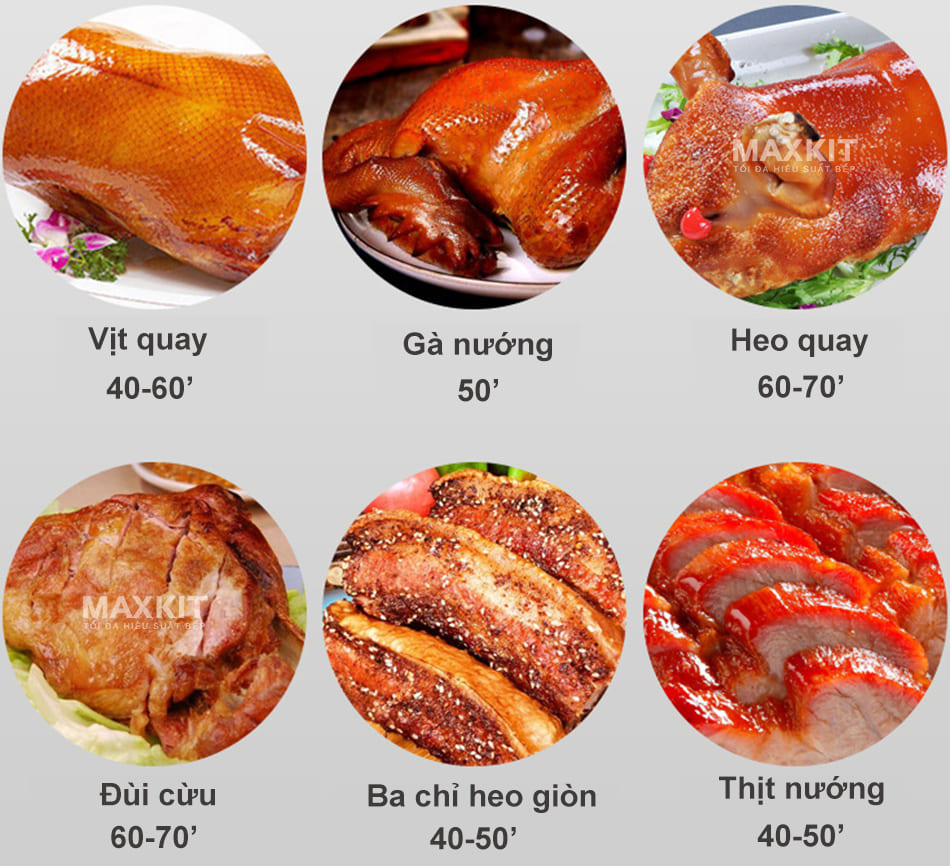 Thời gian quay chín trung bình 50–60 phút/mẻ, tương ứng với năng suất 10–15 con/mẻ. Từ đó, lò đáp ứng nhu cầu phục vụ cao trong giờ cao điểm với năng suất thực tế linh động tùy cách vận hành — phù hợp cho quán ăn và nhà hàng vừa và nhỏ.
