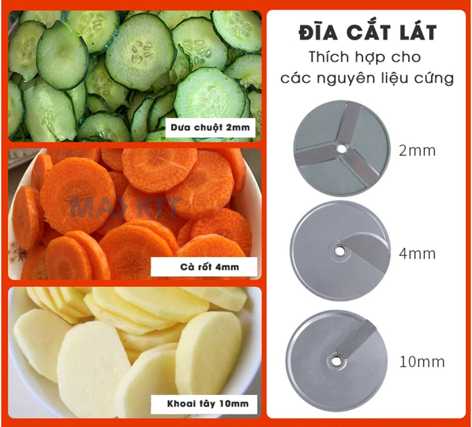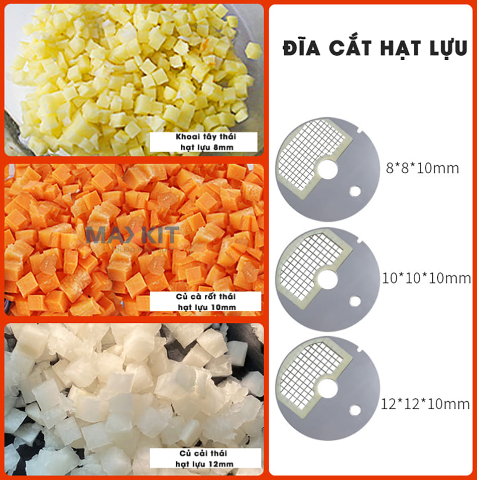 - Đa dạng kiểu thái: 6 bộ lưỡi cho phép thái lát mỏng/dày (ví dụ 2 mm, 4 mm, 8–10 mm), thái sợi tròn/vuông, thái hạt lựu — đáp ứng hầu hết yêu cầu chế biến.