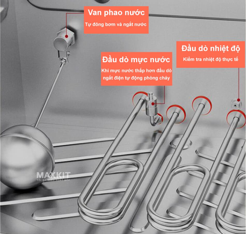 Bên trong, tủ được bố trí hệ thống dẫn hơi/điều khiển nhiệt cân bằng, đảm bảo mỗi khay đều nhận nhiệt đều — điều này rất quan trọng để cơm chín mềm, không bị nát hay sống. Bản lề, tay cầm và các chi tiết tiếp xúc thực phẩm thường sử dụng vật liệu an toàn thực phẩm, dễ tháo rửa. Khoang nấu và khay có thể làm bằng inox tiêu chuẩn thực phẩm để đảm bảo vệ sinh và không ảnh hưởng đến mùi vị.