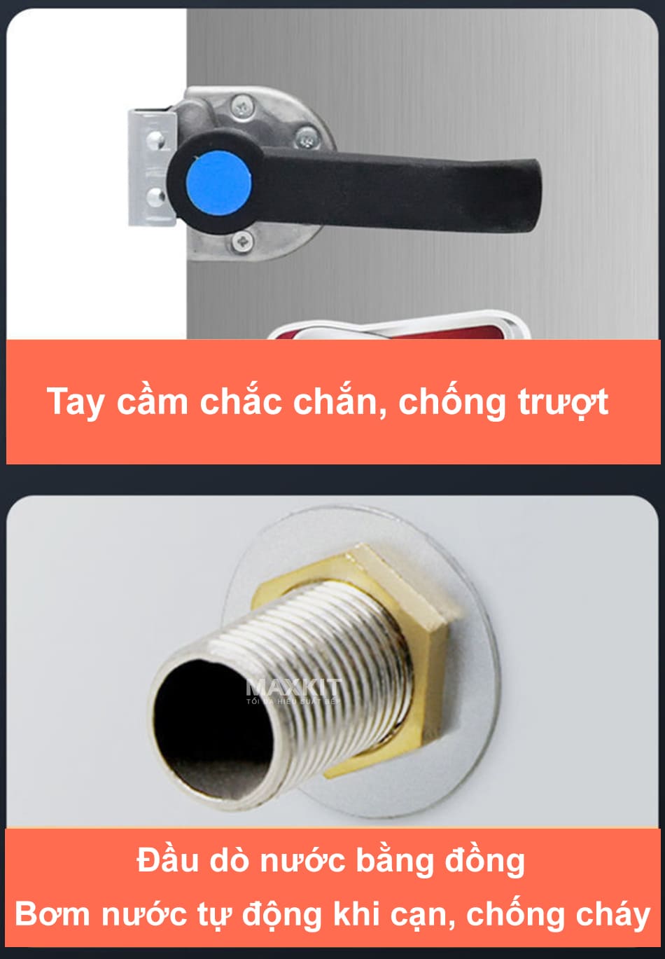 Sử dụng gas làm nhiên liệu giúp tủ nấu cơm đạt nhiệt nhanh, điều chỉnh ngọn lửa linh hoạt và thích hợp với các cơ sở không có nguồn điện công suất lớn hoặc muốn tiết kiệm chi phí đầu tư ban đầu. Với công suất 8 KW và áp suất hoạt động 0.015–0.02 Pa, tủ đạt khả năng cung cấp nhiệt ổn định cho toàn bộ khoang nấu, đảm bảo thời gian nấu khoảng 50–55 phút/mẻ — phù hợp lịch phục vụ liên tục trong ngày.