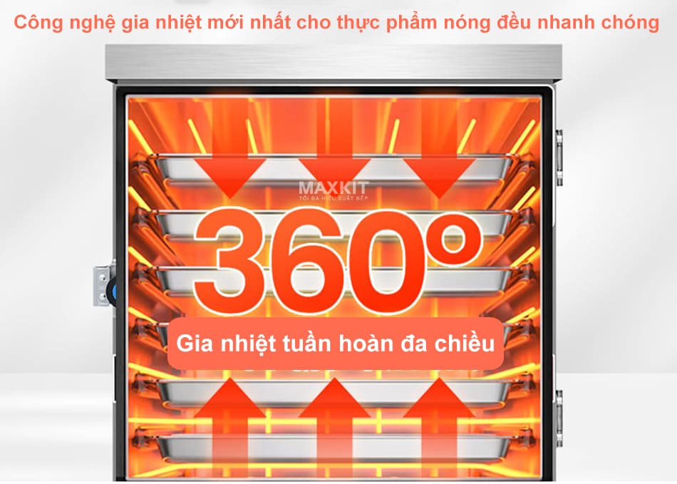 Tủ có kích thước 670 x 510 x 1100 mm—một kích thước tối ưu để đặt trong bếp có không gian hạn chế mà vẫn đảm bảo đủ công suất nấu. Vỏ tủ thường được làm từ thép không gỉ hoặc inox dày, chống ăn mòn và dễ vệ sinh; cấu trúc khung chắc chắn giúp giảm rung lắc khi vận hành và kéo dài tuổi thọ thiết bị. Thiết kế 8 khay xếp chồng hoặc dạng ngăn kéo tối ưu cho việc xếp khay, lấy khay thuận tiện và tránh thất thoát nhiệt.